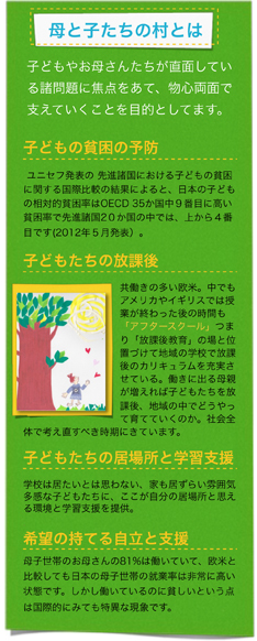 母と子たちの村は、子どもやお母さんたちが直面しているさまざまな問題に焦点をあて、物心両面で支えていくことを目的としています。 |